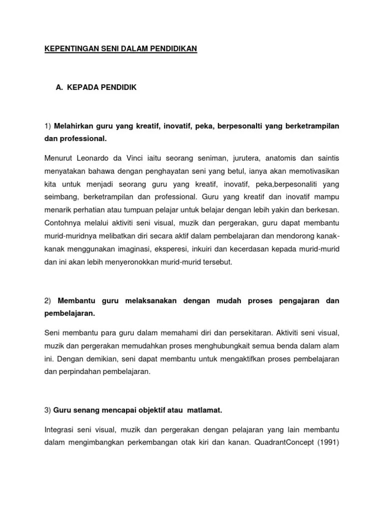 1) melahirkan guru yang kreatif, inovatif, peka, berpesonalti yang berketrampilan dan professional. Thanks for registering with studocu. Seni itu indah dan halus. Tugasan kursus ini bertujuan untuk menghuraikan peranan seni visual, muzik dan pergerakan seni dalam pendidikan supaya guru dapat memahami bagaimana seni .